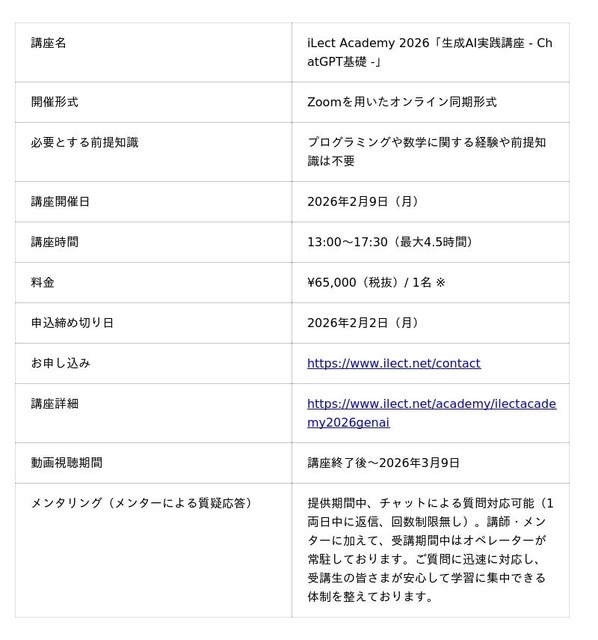 AI総合研究所として活動するNABLAS株式会社(本社 : 東京都文京区本郷、 代表取締役 所長 : 中山 浩太郎、 以下「当社」)が提供する実課題の解決を目的としたAI人材育成サービス iLect は、この度、複数社合同講座 iLect Academy 2026 にて「生成AI実践講座 - ChatGPT基礎 -」(以下:当講座)の開催を決定し、申込受付を開始しました。