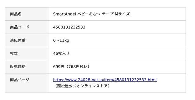 この度、販売開始した「SmartAngel ベビーおむつ テープ Mサイズ」は、テープタイプの紙おむつで、赤ちゃんの快適さ、おむつ交換の際の利便性を追求しながらも、価格は46枚入りで699円(768円税込)と、お求めやすい価格を実現しました。