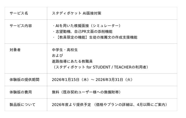 スタディポケット株式会社(本社:東京都千代田区、代表取締役:山地瞭/鶴田浩之、以下「スタディポケット」)は、学校向け生成AIサービス「スタディポケット for STUDENT、for TEACHER」において、AIと音声・ビデオで対話しながら模擬面接ができる新機能「スタディポケット AI面接対策」の体験版を、本日2026年1月15日より順次、提供開始いたします。また、合わせて特設サイト ( https://career.studypocket.ai ) を公開いたしました。