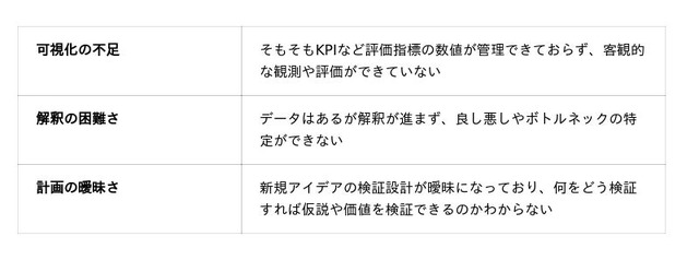 外的要因や市場などの変化が大きいなかで、プロダクト開発は「作って終わり」ではなく、市場やユーザーのフィードバックを得て改善し続ける「アジャイル」で継続的なアプローチが不可欠です。しかし、多くの現場では以下のような課題により、次のアクションへの意思決定が停滞してしまうケースが散見されます。