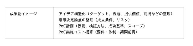 社内で検討中の新規事業アイデア/サービス案について「誰の・どんな課題に・どのような価値/収益モデルで応えるのか」 「PoCで何をどう検証するのか」までを、整理・構造化します。