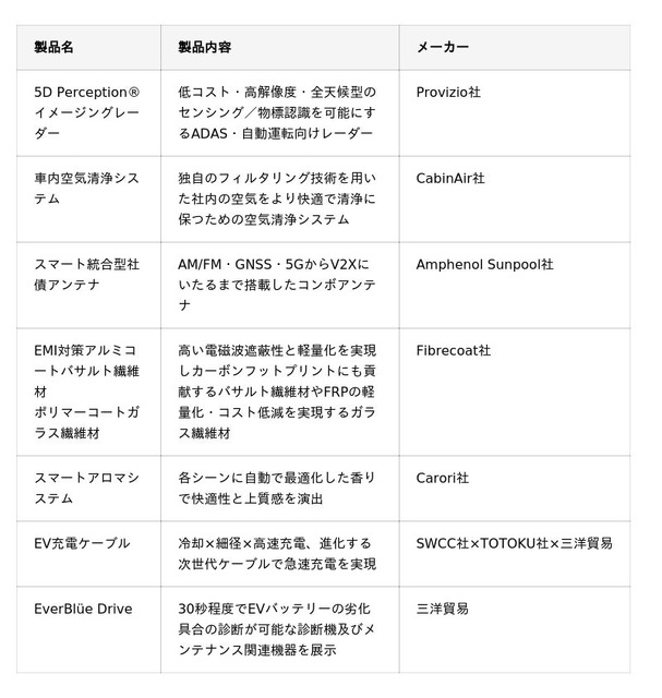 三洋貿易株式会社(本社:東京都千代田区、代表取締役社長:新谷正伸、以下「三洋貿易」)は、1月21日(水)から23日(金)まで開催される「第18回 オートモーティブ ワールド -クルマの先端技術展-」にモビリティ第一/第二事業部が出展します。ブースでは三洋貿易が取り扱う下記製品を展示します。