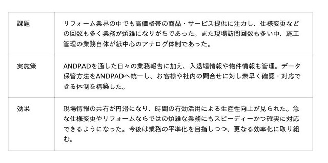 同社は、2016年にリフォーム事業における施工管理の効率化にANDPADを採用し、当時は紙中心のアナログだった施工管理のDXをスタートしました。その後、アフターメンテナンス事業や新築注文住宅事業でもANDPADの活用を広げるとともに、施工管理のみならず基幹システムとの連携やANDPAD Analyticsを使ったデータ分析なども行い、効率的かつ高品質な家づくりを推進しています。