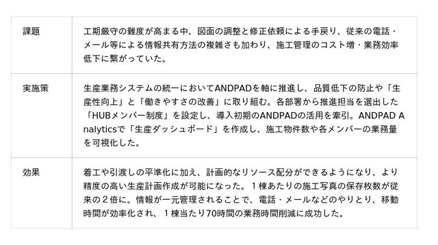 クラウド型建設プロジェクト管理サービス「ANDPAD」を運営する株式会社アンドパッド(本社:東京都港区、代表取締役:稲田武夫、以下アンドパッド)は、三菱地所ホーム株式会社(本社:東京都新宿区、代表取締役社長:細谷 惣一郎、以下三菱地所ホーム)が、施工管理業務の更なる効率化および品質向上を目的に、全社での ANDPAD の運用を開始したことをお知らせいたします。