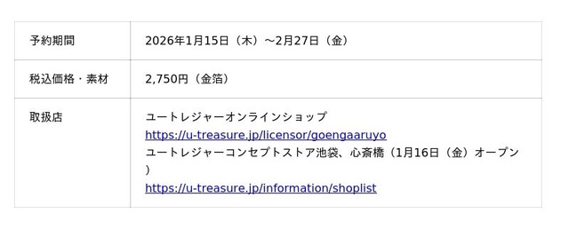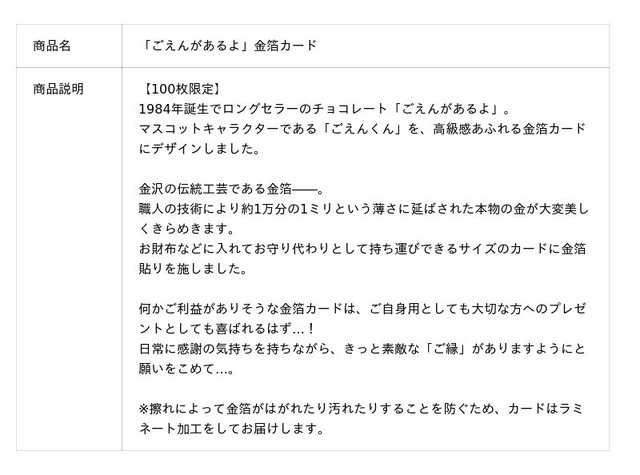 このたびの新作は、チロルチョコ株式会社のロングセラー商品「ごえんがあるよ」の「ごえんくん」をデザインした金箔カードです。お財布などに入れてお守り代わりとして持ち運びできるサイズのカードに金箔貼りを施しました。