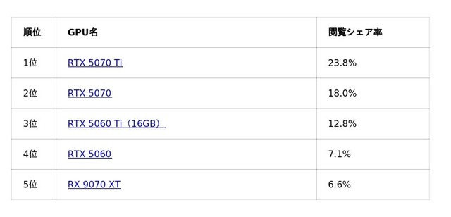 続いて上位には、RTX 5070、RTX 5060 TiといったGPUが続いており、ミドル~ハイエンド帯のGPUに関心が寄せられている形が見られます。