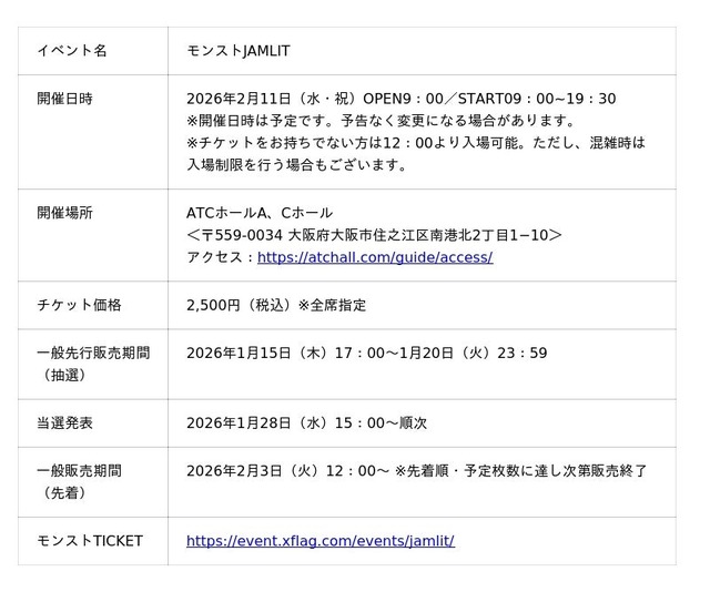 株式会社MIXI(東京都渋谷区、代表取締役社長 上級執行役員 CEO:木村 弘毅)は、スマホアプリのひっぱりハンティングRPG「モンスターストライク」(以下モンスト)の新たなイベント「モンストJAMLIT(ジャムリット)」を2026年2月11日(水・祝)ATCホールA、Cホールで開催します。本日より入場チケットの一般先行販売(抽選)を開始しました。