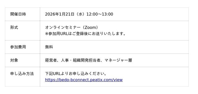 「実行人財の創出」を使命に掲げ、経営戦略と人材戦略の一体化を通じて人的資本経営をリードするビジネスコーチ株式会社(本社:東京都港区、代表取締役社長:細川 馨、東証グロース:9562)の子会社であるB-Connect株式会社(本社:東京都港区、代表取締役社長:杉本 博史、以下当社)は、1月21日(水)に、株式会社Be&Do 事業開発ディレクター 赤澤智貴氏をお招きし共催セミナーを開催いたします。