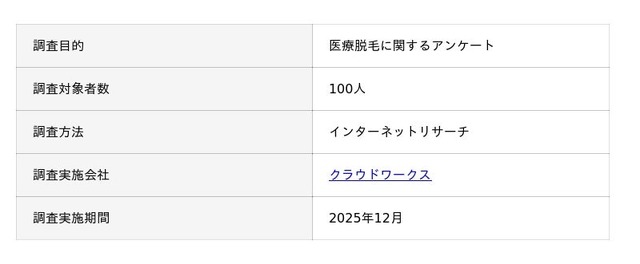 医療脱毛を受けた経験がある100名を対象に、全6項目のアンケートを実施しました。