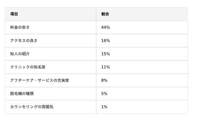 - クリニック選びで最も重視されたのは「料金の安さ」で全体の44%。次いで、「アクセスの良さ」(16%)、「知人の紹介」(15%)に回答が集まった
