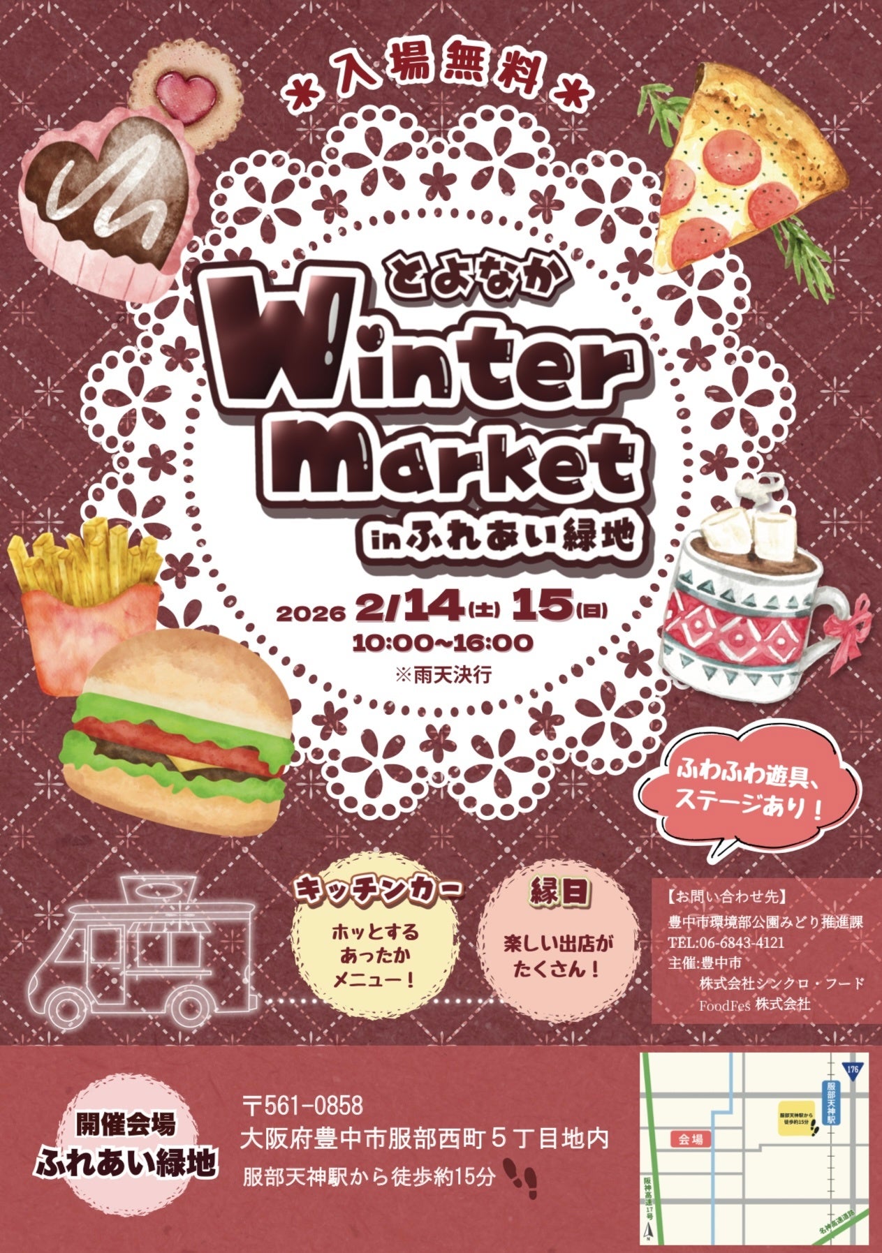 FoodFes株式会社(代表取締役:稲垣一馬)は2026年2月14日(土)・2月15日(日)の2日間、「とよなかWinter market inふれあい緑地」を豊中ふれあい緑地(大阪府豊中市)にて開催いたします。