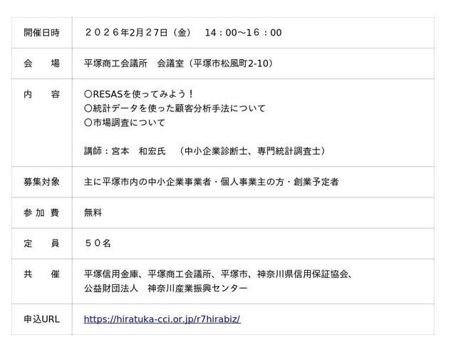 平塚信用金庫、平塚商工会議所、平塚市、神奈川県信用保証協会、公益財団法人 神奈川産業振興センター(5者連携)は『中小企業の経営支援における連携』において、共催セミナーを開催します。環境の変化が著しい昨今、ニーズは多様化し客観的に自社の状況を把握することが難しい時代となりました。本セミナーでは事業の見直しや市場調査に統計データを使って実施する方法を詳しく解説いたします。補助金の申請時にも活用できる内容になりますので、この機会に是非ご参加ください。