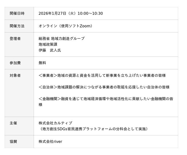 企業版ふるさと納税を活用した地域課題解決プラットフォーム「river(リバー)」を運営する株式会社カルティブ(本社:神奈川県横浜市、代表取締役:池田 清)は各省庁の出している補助金・交付金の活用方法を自治体様向けに伝える「地方創生制度活用シリーズセミナー」として、2026年1月27日(火)に総務省担当者によるオンラインセミナー「ローカル10,000プロジェクト~地域の資源と資金を活用した地域密着型の新規事業の立ち上げ支援~」についてを開催します。