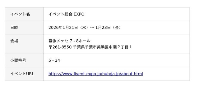 株式会社EventHub (東京都港区、代表取締役CEO:山本 理恵) が提供するシェアNo.1(※)イベント・ウェビナーマーケティングプラットフォーム「EventHub(イベントハブ)」は、2026年1月21日~1月23日に開催される、「イベント総合 EXPO」に出展します。