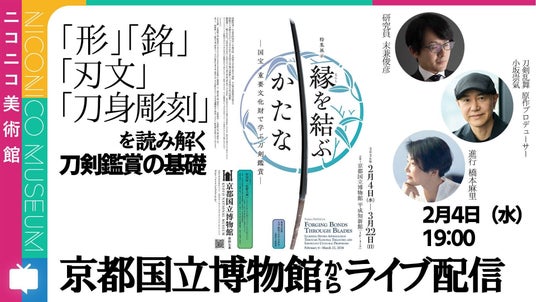 第1回目は、2026年2月4日(水)19時00分より、京都国立博物館で開催される「特集展示 縁(えにし)を結ぶかたな-国宝・重要文化財で学ぶ刀剣鑑賞-」に密着した特別番組として、同社が運営するライブ配信サービス「ニコニコ生放送」と、ニコニコニュース公式YouTubeで配信します。学芸員や専門家の解説とともに、展覧会現地の様子をライブ配信し、展示の見どころや刀剣とその文化の魅力をお届けします。
