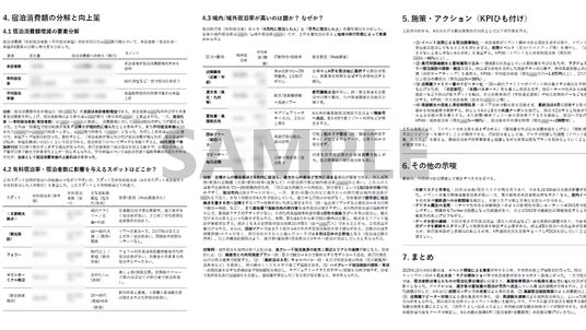自治体・観光協会を対象に、本サービスを活用したAI観光分析レポート(約8頁)を無料で提供するモニターキャンペーンを実施します。AI観光分析レポートは、対象地域(市区町村単位)における観光指標を結果から要因まで一貫して構造化し、変動の背景を読み解くことを目的とした分析レポートです。市町村来訪者数・域内宿泊人数・域内宿泊消費額といった主要指標を分解し、域内泊率等の行動プロセス指標や観光スポット単位の来訪変動、Web上の公開情報・イベント情報を構造化して組み合わせることで、指標変動の要因をAIが整理・分析します。これにより、個別施策の評価にとどまらず、他地域や他施策にも応用可能な再現性のある示唆を得られる点が特長です。
