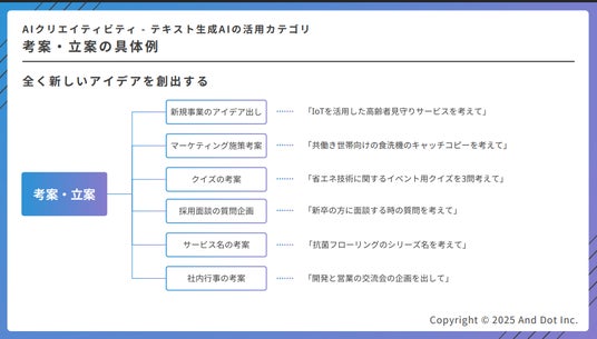 AIでどのような活用ができるかを考案・企画するスキル(AIクリエイティビティ)を向上。業界業務に特化し、市場分析、商品企画、営業戦略に直結する具体的な活用分野におけるアイデアを創出。