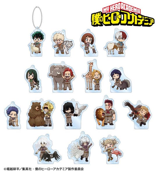 緑谷出久、爆豪勝己、麗日お茶子、轟焦凍、蛙吹梅雨、切島鋭児郎、上鳴電気、耳郎響香、心操人使、オールマイト、相澤消太、エンデヴァー、ホークス、死柄木弔、荼毘、トガヒミコの描き起こしちびキャラビジュアルをメインにデザインし、アクリルキーホルダーに仕上げました。