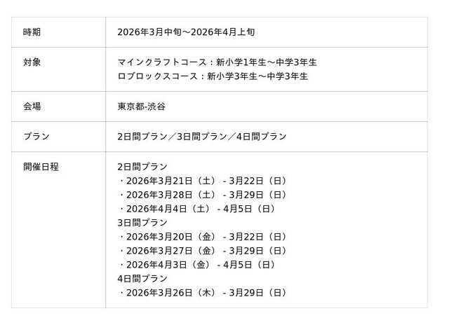 「Tech Kids CAMP Spring 2026」では、教育版マインクラフト「Minecraft Education」(※1)を使用するマインクラフトコースと、ゲーム開発環境「Roblox Studio」(※2)を活用するロブロックスコースの2コースを実施いたします。