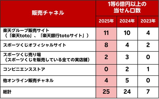 (注3)本発表は、スポーツくじオフィシャルサイトの情報に基づき、特別開催回を含む1等当せん口数を楽天が集計したもので比較しています。なお、2025年の当せん口数は第1506回(販売期間2024年12月29日~2025年1月4日)から第1598回(販売期間2025年12月26日~12月29日)までが対象です。