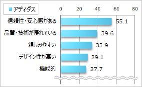 一番好きなブランド上位3位の『アディダス』『ナイキ』『ニューバランス』のイメージをみると、「信頼性」「品質」に次いで、『ナイキ』では「デザイン性が高い」、『アディダス』『ニューバランス』では「親しみやすい」が続きます。