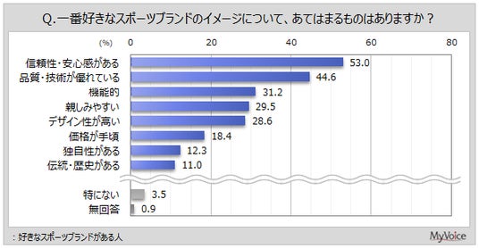 好きなスポーツブランドがある人に、一番好きなブランドのイメージを聞いたところ(複数回答)、「信頼性・安心感がある」が53.0%、「品質・技術が優れている」が44.6%、「機能的」が31.2%となっています。