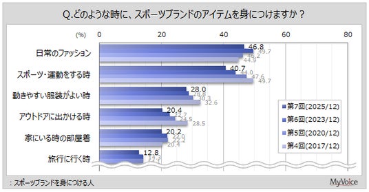 スポーツブランドを身につける人の利用場面は(複数回答)、「日常のファッション」が46.8%、「スポーツ・運動をする時」が40.7%、「動きやすい服装がよい時」「アウトドアに出かける時」「家にいる時の部屋着」が各20%台です。