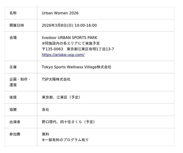 TSP太陽株式会社(本社:東京都目黒区、代表取締役社長:池澤 嘉悟、以下 当社)は、企画・運営・会場設営を手掛ける体験型イベント「Urban Women 2026」を、2026年3月8日(日)に初開催いたします。イベント当日の3月8日は国際女性デー。昨年は日本初の女性首相が誕生したこともあり、女性のエンパワーメントへの注目が一層高まっています。