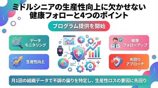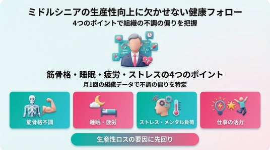 ミドルシニア層は、現場の中核やマネジメントを担い、品質・納期・意思決定・育成など組織のアウトプットに大きく関わる一方で、業務負荷の高まりや生活リズムの変化などを背景に、筋骨格の違和感、睡眠の乱れや疲労の長期化、ストレス負荷、仕事の活力低下といった不調が重なりやすい層でもあります。こうした状態は、欠勤や休職のような分かりやすい事象になる前から、集中力の低下、判断の遅れ、手戻りの増加、レビュー工数の増大、コミュニケーションの停滞などを通じて、現場の見えにくい生産性ロスとして積み上がりやすくなります。