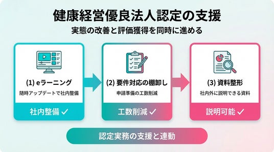また、本プログラムは健康経営優良法人認定も視野に、eラーニングを活用した社内整備、要件対応の棚卸し、社内外に説明できる資料整形など、認定実務の支援とも連動します。申請のための作業に留まらず、実態の改善と評価獲得を同時に進めることを目的としています。取り組みの全体像が説明可能な形で整理されるため、経営判断や管理職層への展開、対外的な説明にも転用しやすくなります。