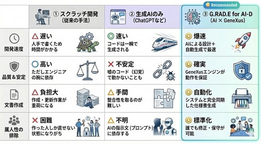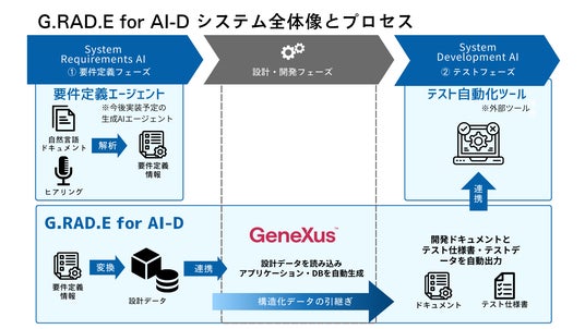 「G.RAD.E for AI-D」は、こうした課題に対し、 実際のシステム開発は従来より採用してきたローコード開発ツールGeneXusでの自動生成をそのまま活かし、さらに、GeneXusへ渡す設計情報や、生成したシステムの開発ドキュメント作成、テスト仕様書作成など、従来は人の手がかかり属人化が避けられなかった工程に生成AIを活用することで、品質を担保しながらエンジニアがクリエイティブな業務に集中できる環境を提供するために開発されました。