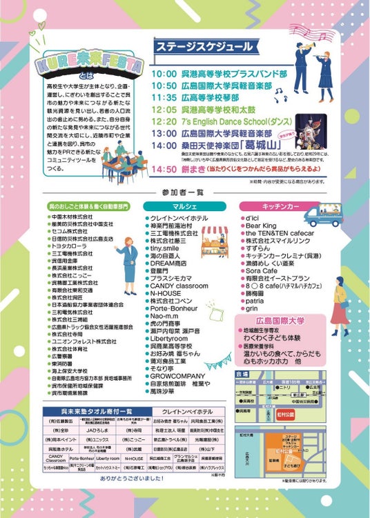 ・出展内容:ステージ発表、呉のおしごと体験&働く自動車、マルシェ、キッチンカーの出展など