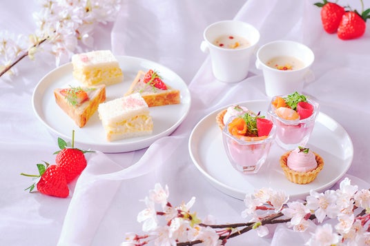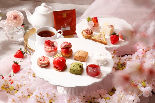 桜色の華やぎに満ちた優雅な世界観の中で、いちごの甘い誘惑と桜の香りに包まれる、心ときめく至福のティータイムをお過ごしください。