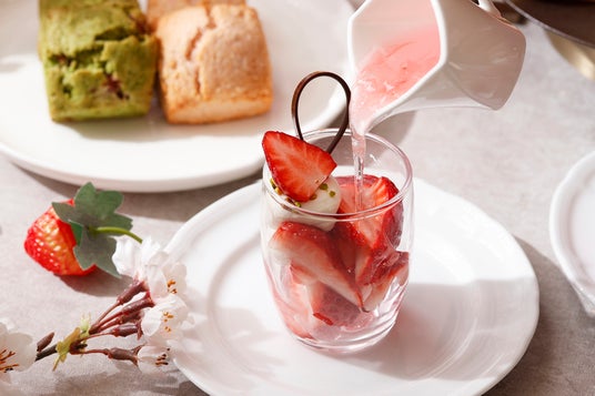 スペシャルディッシュには、瑞々しい旬のフレッシュいちごをご用意。さっぱりとした桜ソースを注ぐことで、いちご本来の甘みがより一層引き立ち、フレッシュな美味しさを心ゆくまでお楽しみいただけます。