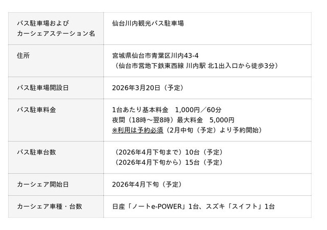 仙台市(市長:郡和子)と公益財団法人仙台観光国際協会(理事長:結城由夫)およびパーク24株式会社(本社:東京都品川区、社長:西川光一、以下「パーク24」)は、2025年4月に締結した「観光における二次交通の拡充と旅行者ならびに市民の利便性向上に関する連携協定(以下「本協定」)」に基づき、観光にかかる二次交通実証事業(パーク24グループの運営による、観光バス駐車場事業およびカーシェアリング事業)を実施いたします。