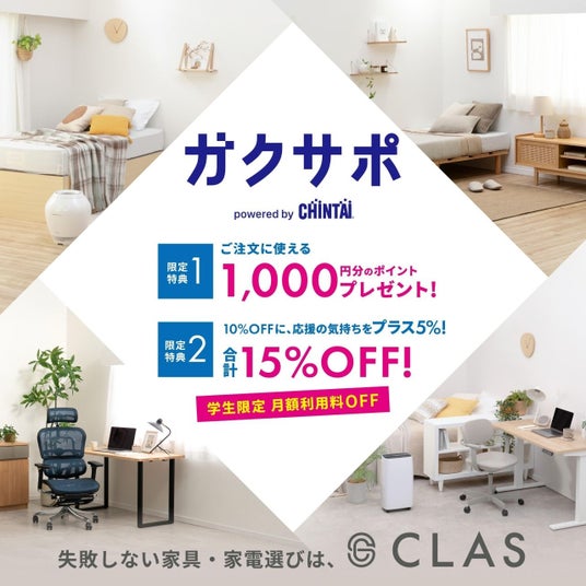 これにより、CHINTAIが展開する学生の初めての一人暮らしを応援する取り組み『ガクサポ』の利用者を対象に、家具と家電のレンタル・サブスク『CLAS(クラス)』をお得に利用できる限定特典の提供を開始いたします。
