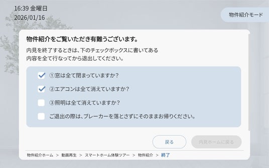 5. 退出時チェック機能:オーナー資産を守る安心設計内見終了時の退出前には、「窓の施錠確認」「エアコン・照明の消灯」などのチェック項目を画面に表示します。人為的なミスによる雨水浸入等の物件被害や、無駄な電気代の発生を抑制し、安全な空室運用を実現します。