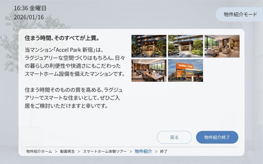 2. 動画再生機能:コンセプトや利用イメージを動画で訴求物件のコンセプトムービーや紹介動画を再生可能です。また、スマートホーム機能や管理機能の紹介動画があらかじめプリセットされているため、個別の動画素材がない場合でも、先進的な設備の魅力を訴求できます。