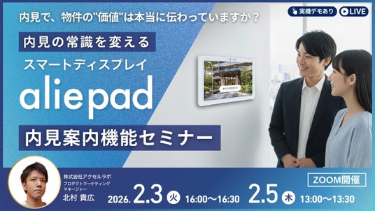 株式会社アクセルラボ(本社:東京都新宿区、代表取締役:小暮 学、以下 「当社」)は、スマートディスプレイ「aliepad(アリーパッド)」において、新たに「内見案内機能」を実装し、提供を開始することをお知らせいたします。 本機能は、賃貸住宅向けスマートホーム「SpaceCorePro(スペースコア・プロ)」をご利用いただいている、aliepad導入物件であればご利用いただけます。