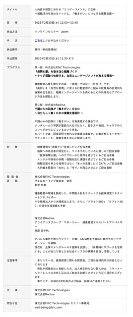 予防ヘルスケア×AI(機械学習、生成AI)に特化したヘルステックカンパニーの株式会社FiNC Technologies(本社:東京都千代田区、代表取締役社長:小島 かおり、以下「当社」)は、復職・就職支援をおこなう株式会社Rodina(本社:広島県広島市、代表取締役:山田 康輔)と、健康経営に関する無料共催ウェビナーを開催いたします。