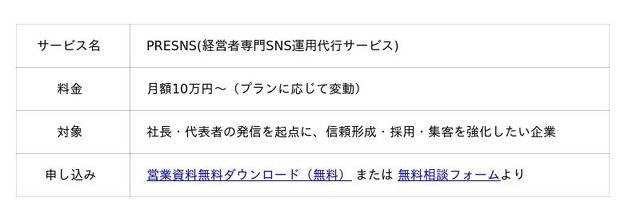 PRESNSは、社長・代表者の言葉・経験・意思決定をコンテンツ化し、SNSを通じて信頼が蓄積される状態をつくるSNS運用代行サービスです。