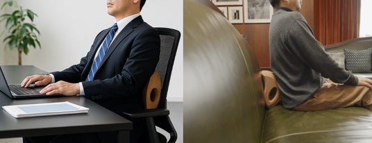 ソファや椅子に挟むだけで、骨盤から自然と背すじが伸びる。やわらかな曲線が背中に心地よく沿い、“ながら”で姿勢が整う実感を。