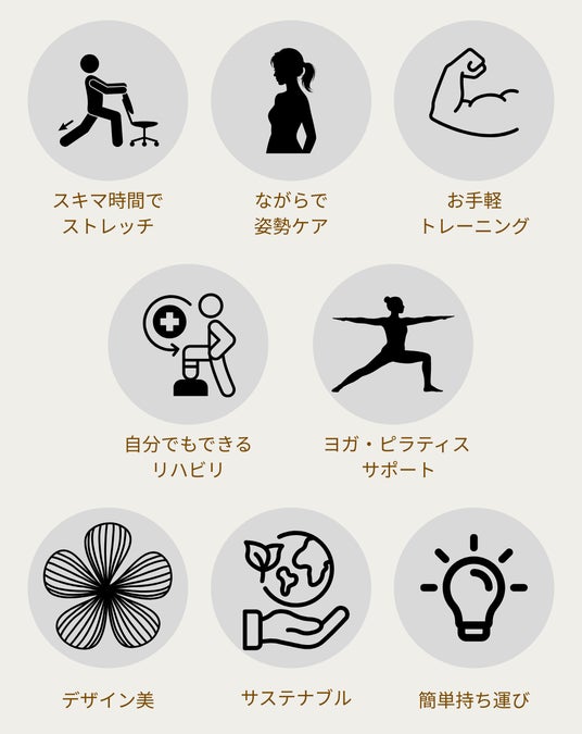 再生可能なコルク調素材を使用し、環境にも配慮。「続かない」「邪魔になる」「面倒くさい」といった従来のトレーニングツールの課題を解消し、“ながら”で気軽に取り入れられる習慣づくりをサポートします。