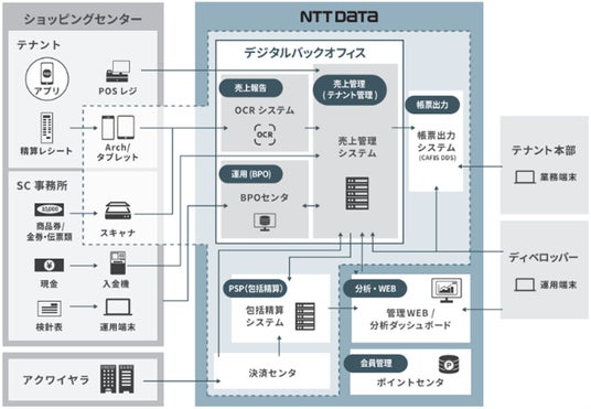 NTTデータの「デジタルバックオフィス」は、売上管理業務をワンストップでサポートするサービスとして、会員管理システムや決済サービスと共にショッピングセンターに導入されています。本サービスにおいて、NTTデータの開発したアプリケーションにて「QuickData精算レシート」を活用することにより、テナント毎の売上情報のスピーディーな可視化を実現しました。
