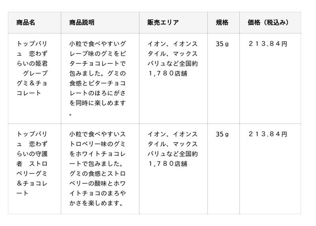 本商品は、「グミ」と「チョコレート」を組み合わせた商品です。グミをチョコレートで包むことで、グミの弾力とチョコレートならではの甘みやなめらかな口どけを一度に楽しめます。2026年1月20日(火)から全国の「イオン」、「イオンスタイル」、「マックスバリュ」で販売されます。