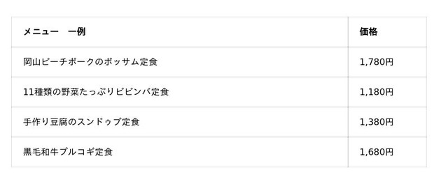 ランチタイムには、ポッサムやピビンバ、スンドゥブなど韓国の定番料理を主菜にした定食を5種類ご用意します。日替わりのお惣菜やナムル、十六黒米のご飯を組み合わせ、ヘルシーでありながら色鮮やかで見た目にも満足感のあるメニューです。