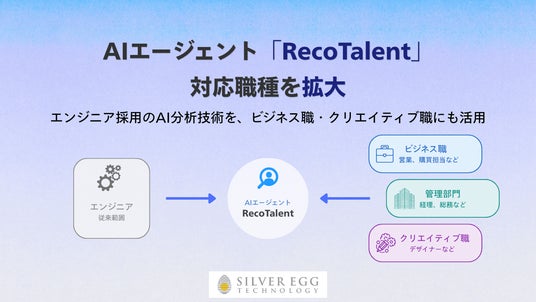 シルバーエッグ・テクノロジー株式会社(本社:大阪府吹田市、代表取締役社長 兼 CEO:トーマス・フォーリー、以下 シルバーエッグ)は、2025年8月に、エンジニア採用のAI分析技術を活用したAIエージェント「RecoTalent for エンジニア」の提供を開始いたしました。今回、対象職種を拡大し、AIエージェント「RecoTalent(レコタレント)」として、幅広い職種に対応しました。