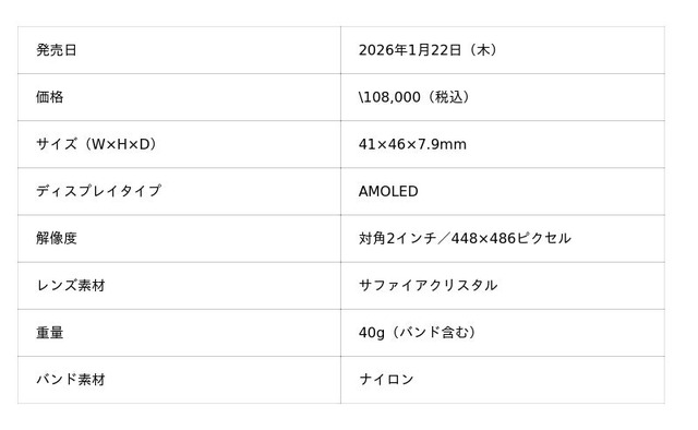 ・本体(バックケース)はチタン、レンズは傷がつきにくいサファイアクリスタルを使用し、高級感と耐久性にもこだわった洗練されたデザインです。バンドは柔らかくフィット感のよいナイロンバンドで、アクティビティ中も快適に着用できます。