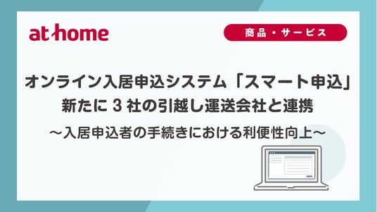 不動産情報サービスのアットホーム株式会社(本社:東京都大田区 代表取締役社長:鶴森 康史 以下、アットホーム)は、賃貸物件の入居申込をオンライン上で行える「スマート申込」において、引越し運送・引越し付帯サービス業務を手掛ける株式会社アップル(本社:東京都中央区 代表取締役:文字 放想)、株式会社トレジャー・ファクトリー(本社:東京都千代田区 代表取締役社長:野坂 英吾)、中尾運輸株式会社(本社:大阪府大阪市 代表取締役社長:東 宏樹)と連携したことをお知らせいたします。