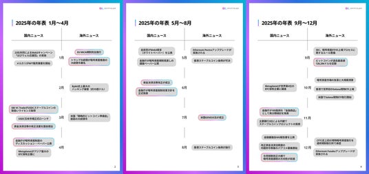 法人向けにWeb3ソリューションを展開する株式会社クリプトリエ(所在地:東京都中央区、代表取締役 CEO:手塚 康夫、以下 クリプトリエ)は、2025年に国内外で起きたWeb3・暗号資産領域の主要な動向をまとめた「国内・海外Web3市場最新動向レポート」を本日公開いたしました。 本レポートでは、最新の市場動向や活用事例を20,000字・40ページを超える大ボリュームで網羅的にカバーしています。Web3領域に新規参入を検討される企業の皆さまの事業戦略の立案や業界情報の調査に、ぜひお役立てください。